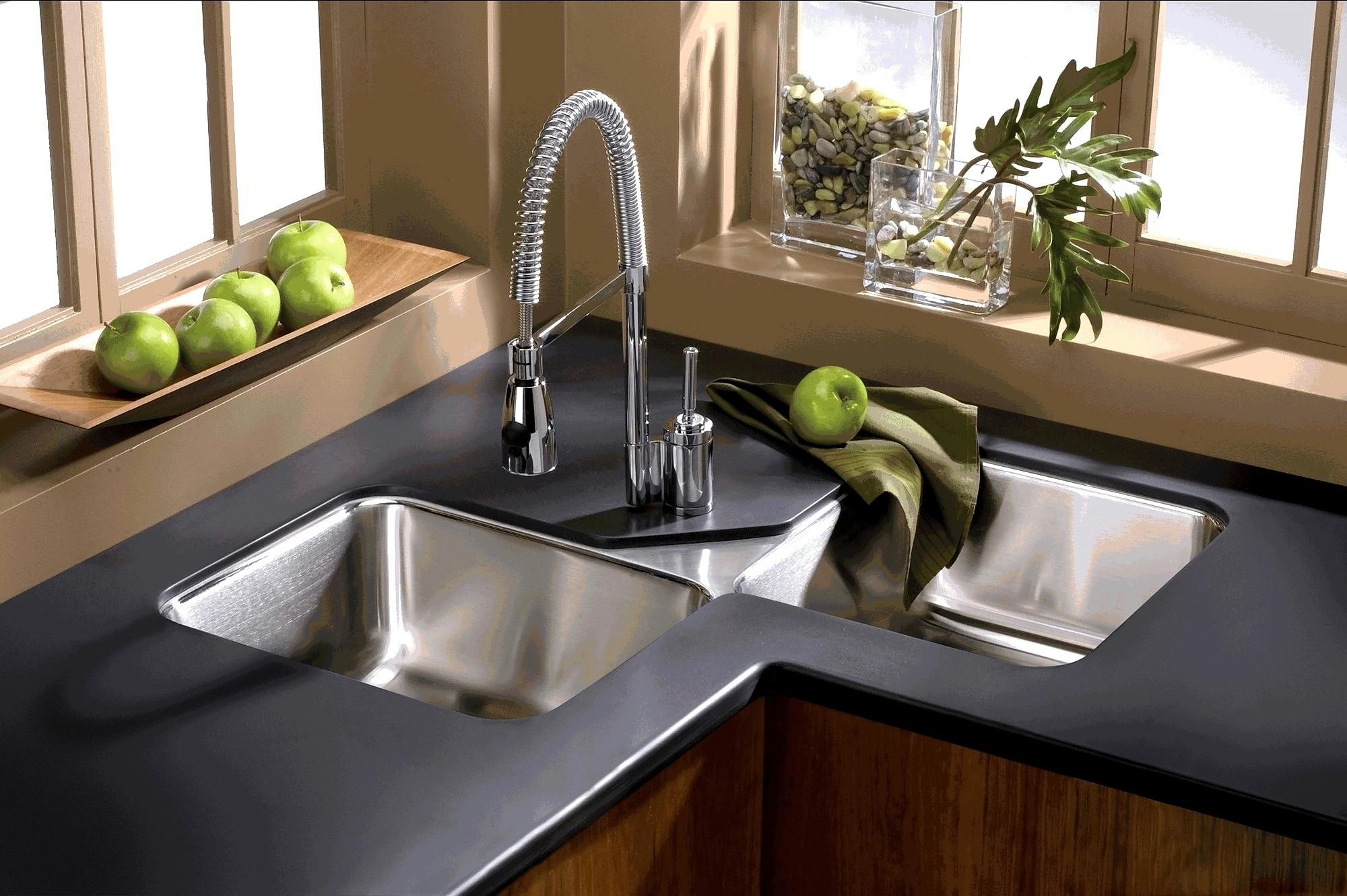 Угловые мойки для кухни из нержавейки помогут максимально эффективно задействовать кухонное пространство. При угловом размещении даже на небольшой кухне можно установить двойную мойку.