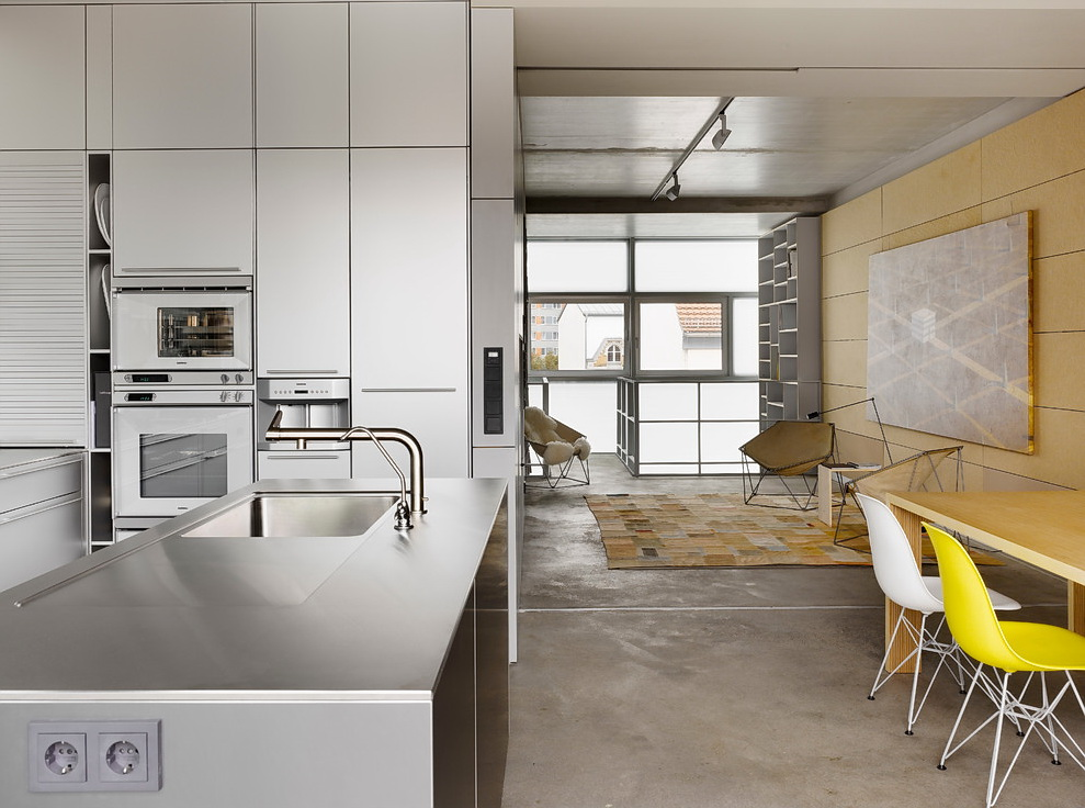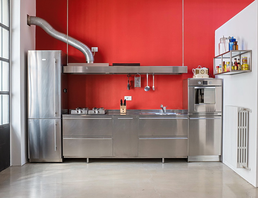 Весь кухонный гарнитур, включая мойку, выполнен из нержавеющей стали