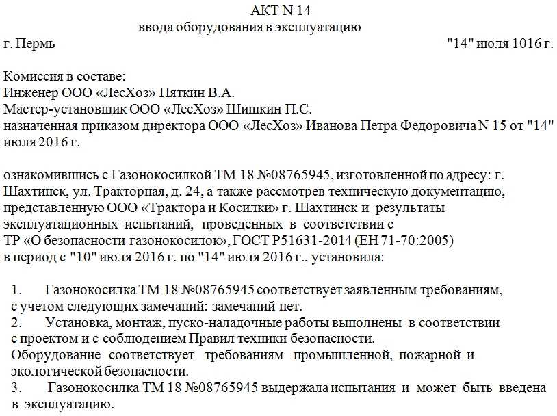 Предпоследняя часть документа содержит выводы по всей вышеозначенной процедуре. Если претензий к оборудованию нет, то здесь нужно вписать, что оборудование вводится в эксплуатацию с такого-то числа по такому-то адресу (указывается адрес предприятий, на котором оно будет использоваться).