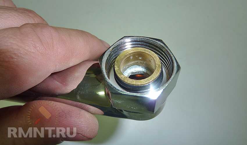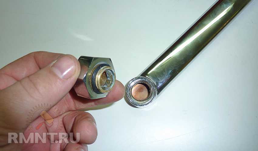 Для плоских изливов процесс демонтажа аналогичен — отворачиваем крепёжную гайку и снимаем излив. На внутренней части так же видны два уплотнительных кольца, которые нужно заменить.