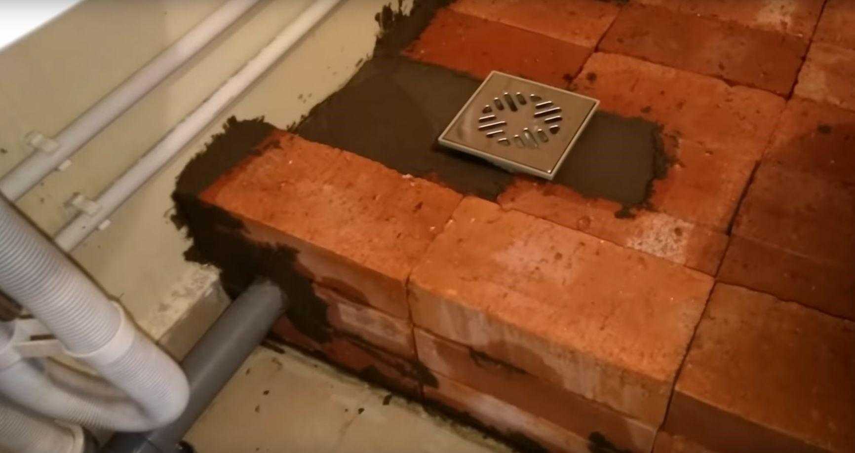 Если в распоряжении работника имеется целый кирпич хорошего качества, можно изменить порядок работ: в начале выложить ровную площадку, закрепляя душевой трап стяжкой, после по краю площадки выложить бортик высотой в один или несколько кирпичей.