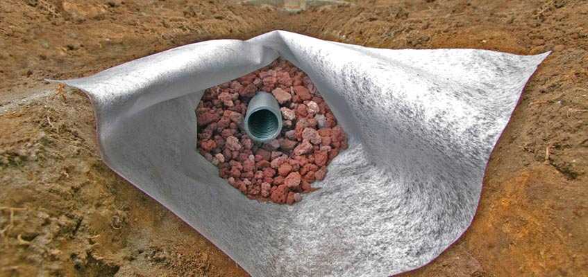 Геотекстиль предохраняет щебенчатую обсыпку от размывания, а также удерживает грунт от проседания. Как сказано в РМД, «геотекстильный фильтр должен пропускать воду и отсеивать грунт, излишне не деформироваться и не ограничивать доступ влаги в дренажную конструкцию, обладать био- и химической стойкостью» (РМД, 10.2).