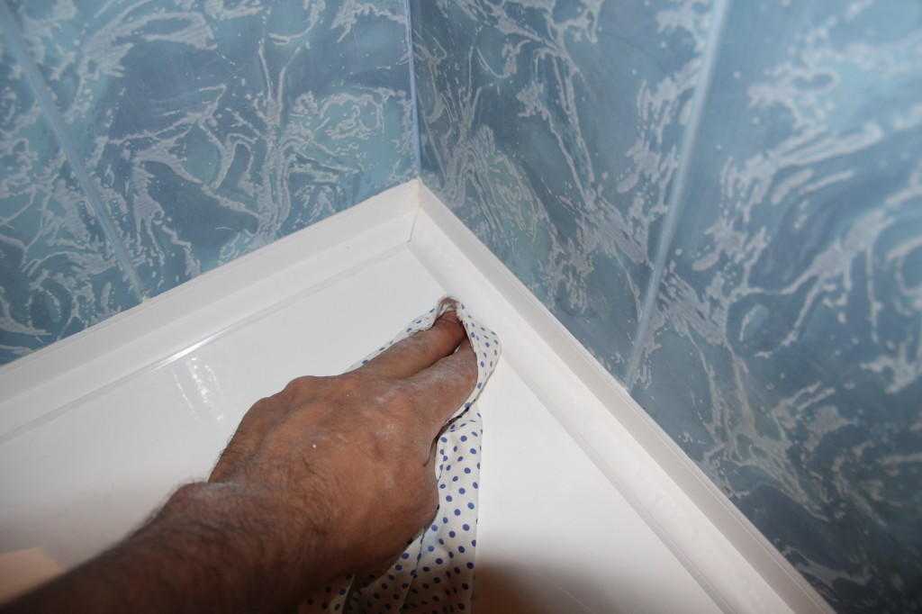 После этого поверхность и ванны и кафеля нужно высушить, так как с мокрым покрытием клей не сцепится, и придется проводить повторные монтажные работы. Для обезжиривания поверхности кафеля, подойдет спирт или уайт-спирит. Слишком агрессивные составы использовать нельзя, так как они могут разъесть пластиковый уголок. Нанесение клея проводится по периметру обратной стороны уголка, но линия должна быть максимально тонкой. Чтобы заделать швы между ванной и стеной, можно применять силиконовый герметик или шпаклевку, обладающую устойчивостью к воде и повышенной влажности.
