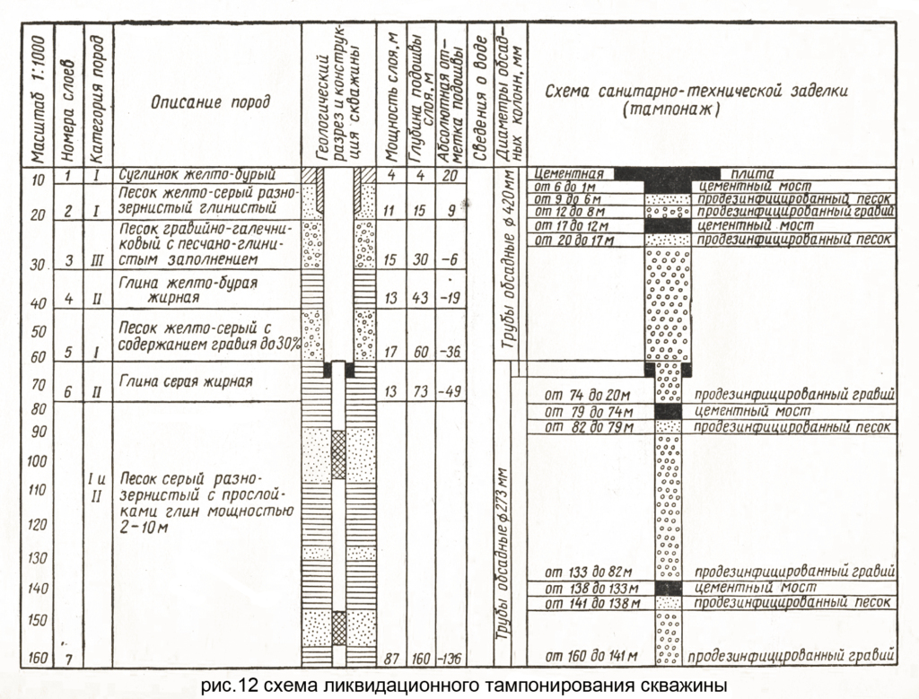 В зависимости от условий данной местности, осуществляется тампонирование с последующей ликвидацией. Но для данной работы нужно в обязательном порядке выполнять некоторые работы. Ствол в скважине нужно проработать по всей его длине, используя инструменты для бурения. Стенки обрабатываются с целью устранения возможных источников заражений. Для дезинфекции внутренней части используется хлорная известь, а затем откачиваем воду. Зона фильтрации должна быть засыпана песком или глиной, щебнем и гравием (выбор материала зависит от особенностей ствола). Затем над засыпкой нужно установить мост из цемента. В устье делаем небольшой шурф и заливаем бетоном, а сверху устанавливаем табличку, где содержится информация о дате закрытия, а также работниках, которые провели данную процедуру.