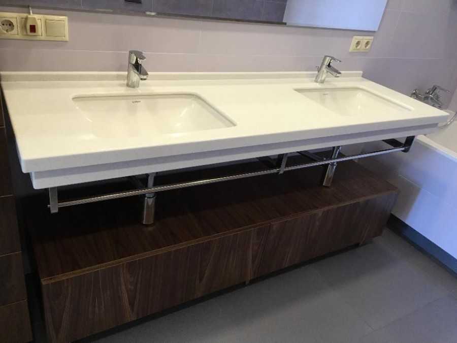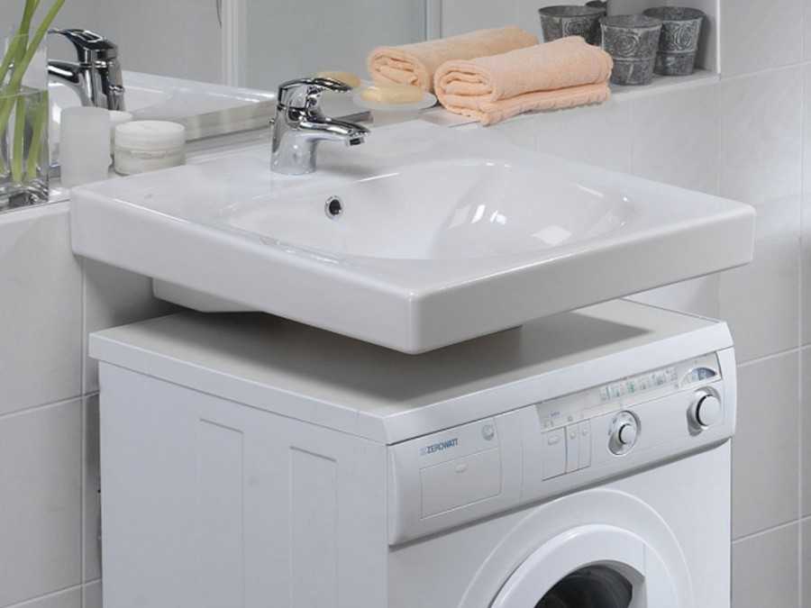 Подобная установка раковины имеет как плюсы, так и минусы. Так, благодаря отсутствию стыков, проблемы с протечкой воды устраняются, а на поверхности столешницы можно хранить принадлежности и аксессуары. Такую конструкцию без труда можно разместить над стиральной машиной. К раковине подводится труба таким же образом, как и к плоской навесной раковине.