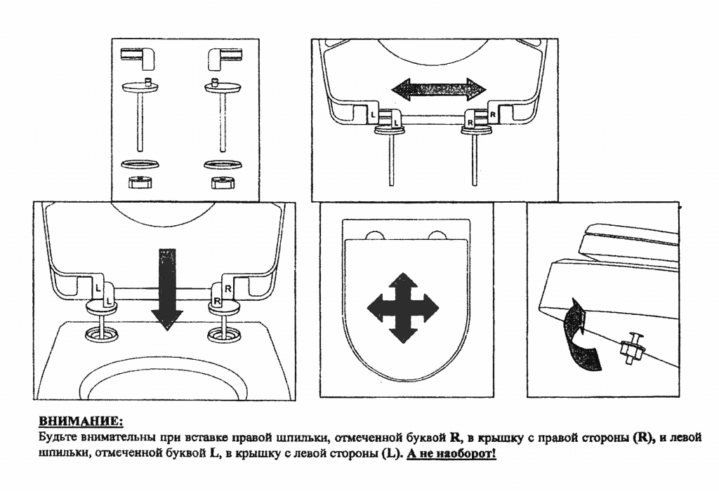 Чтобы разобрать конструкцию, на левой ножке крепежа колпачок для его монтажа проворачивается в правую сторону, на правой стороне — в левую. Далее необходимо снять крышку вместе с сиденьем