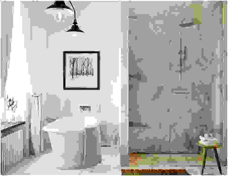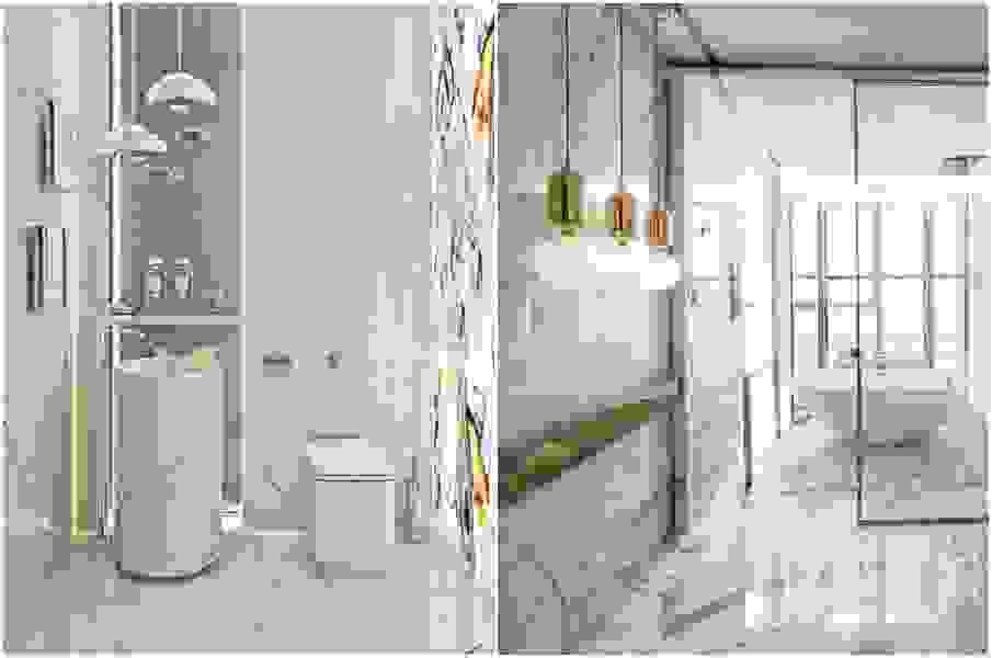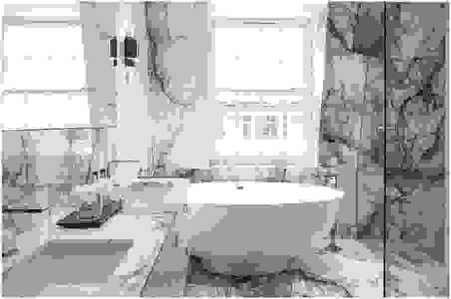 Пример удачного использования мрамора для облицовки ванной в квартире: архитекторы Adamant Group удачно скомбинировали разные оттенки мрамора, создав теплую и уютную атмосферу с освежающими вкраплениями белого.