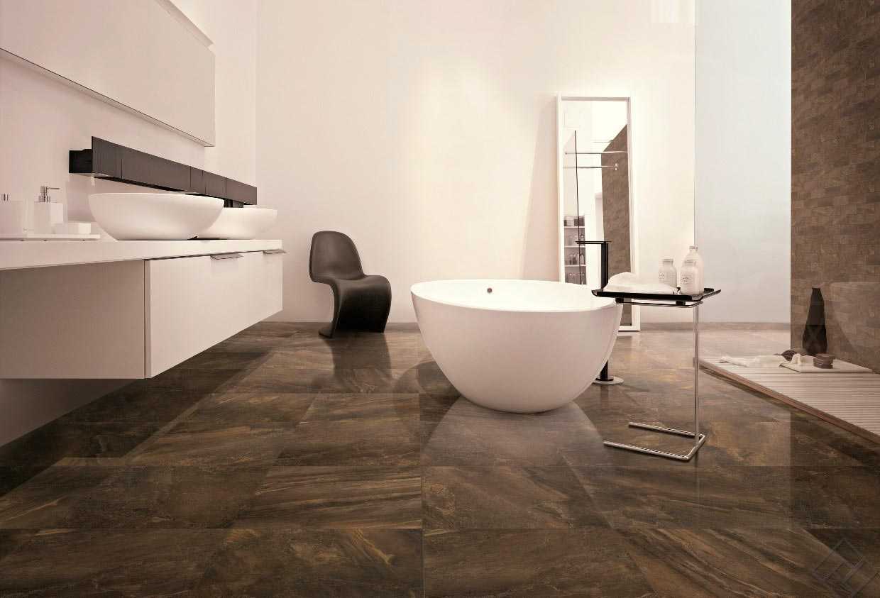 Для укладки пола уместным будет вариант с керамической плиткой или керамогранитом. Однозначно не стоит использовать ламинат, дерево или ковролин. Для быстрого высыхания поверхности пола после приема ванн, устанавливают подогрев теплого пола.