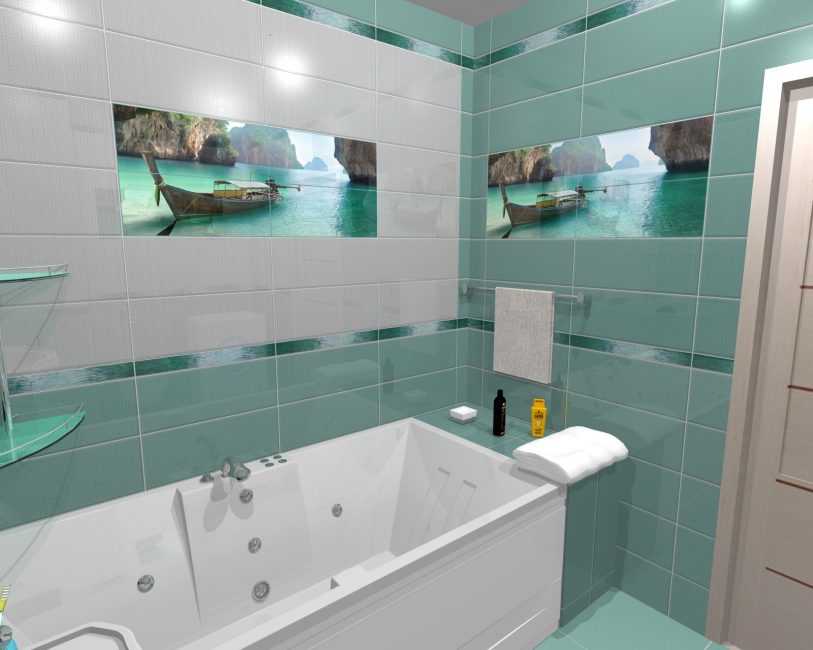 - Горизонтальный кант. Если в санузле установлено много мебели, допустимо использование такого декорирования, учитывая, чтобы настенное изображение не получилось закрытым. Разделить низ и верх поверхности можно декоративной полосой контрастного цвета, уложенной в 1-3 плитки или в шахматном порядке.
