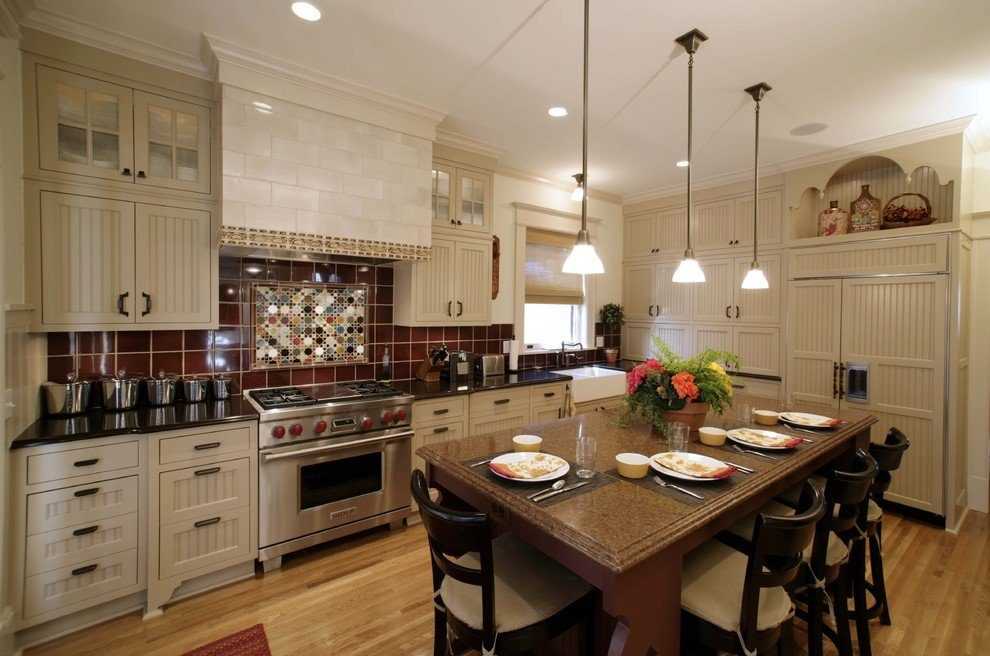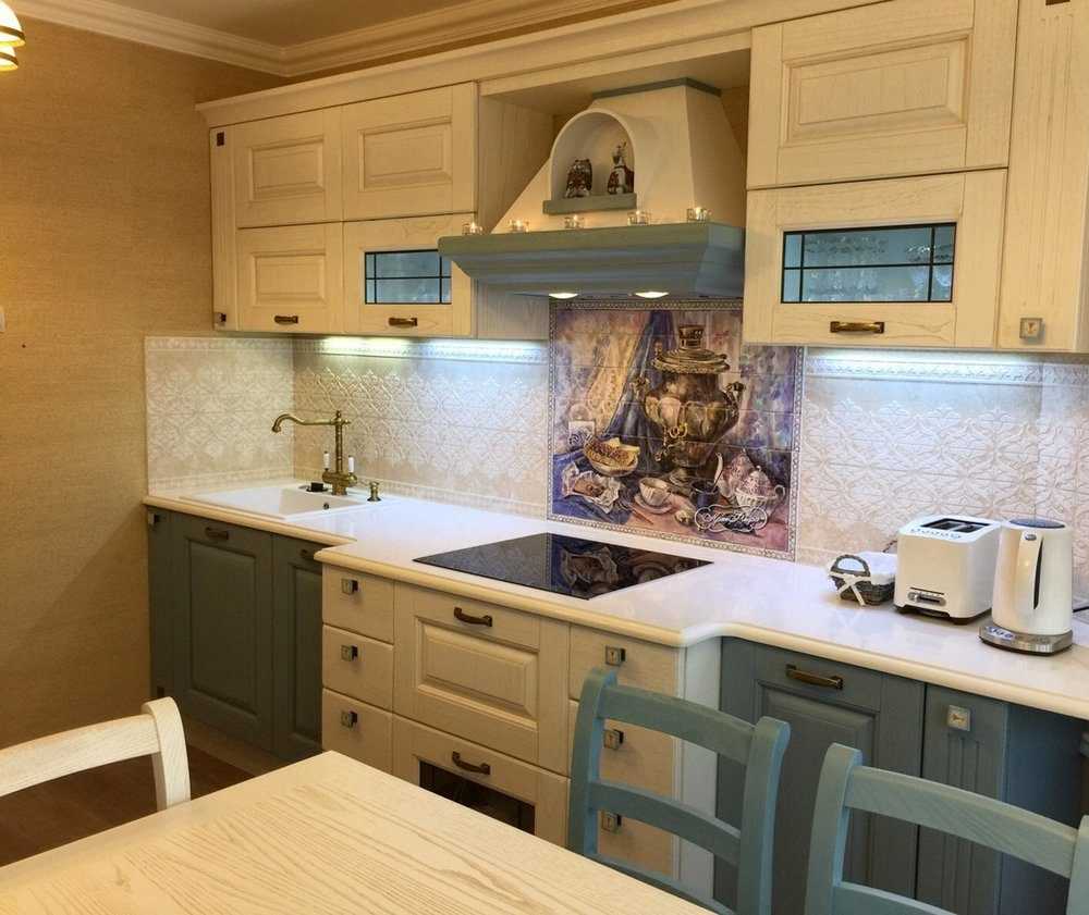 Светлая кухня в стиле кантри с ярким фартуком из керамики