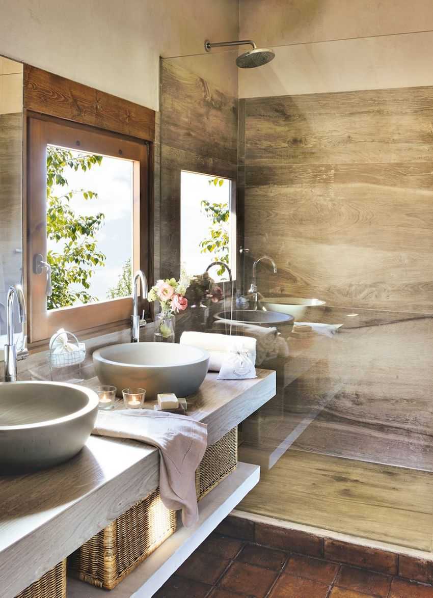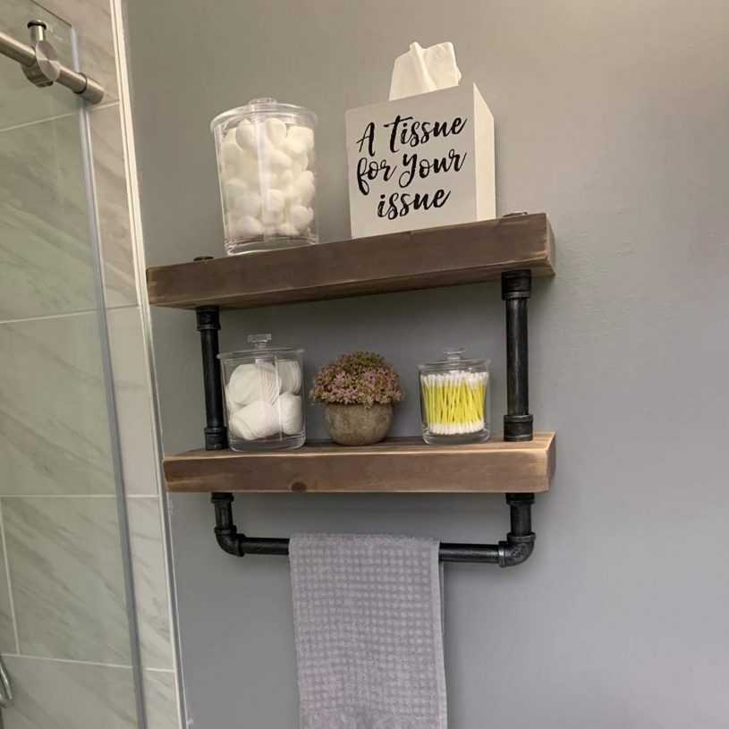 Достаточно необычный материал для изготовления конструкции – дерево. За счет своей текстуры и экологичности дерево может придать ванной теплую и уютную атмосферу, особенно если сочетать полочки с другими деревянными предметами в комнате. Если решили сделать полочку из дерева, то помните, что выбранный материал должен быть качественным, влагостойким. Дополнительно его можно обработать специальными составами, которые будут отталкивать влагу.