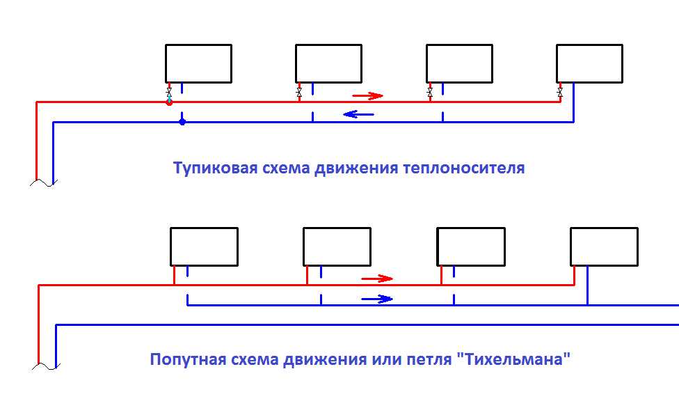 Схема двухтрубного отопления, в которой горячая вода двигается в разные стороны, называется встречной или тупиковой. Когда движение теплоносителя осуществляется по обоим трубопроводам в одном направлении, называется попутной системой.