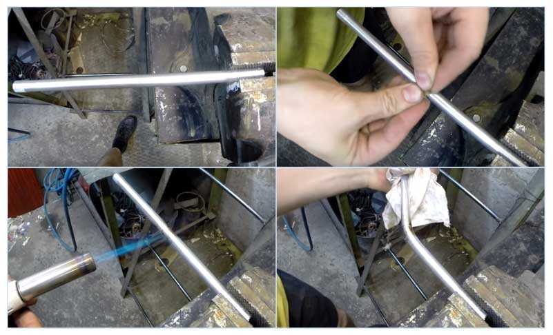 Популярная в быту технология применяется в случаях, когда отсутствует трубогибный аппарат или нет возможности произвести работы холодным способом, процесс состоит из нескольких операций: