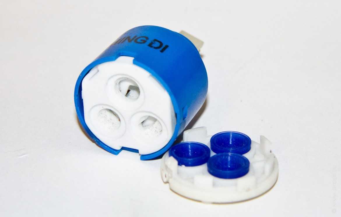 Если причиной передавливания стал одноручковый смеситель, скорее всего, дело в неисправном картридже. Деталь составляют две керамические пластины, смешивающие жидкость путем совмещения отверстий. Со временем они теряют герметичность, и устройство начинает протекать, либо происходит вытеснение жидкости, находящейся под большим напором.