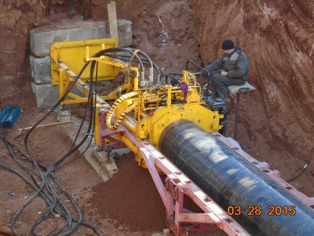 На 2 этапе работ к проложенным по оси бурения пилотным штангам присоединяется расширитель, соединяющий пилотные штанги и прокладываемые трубы. Оператор вдавливает трубы по направлению, заданному пилотными штангами, а грунт попадающий внутрь трубы размельчается буровой головкой и транспортируется шнеками по трубам в стартовый котлован. Пилотные штанги удерживают трубы от смещения с оси бурения, постепенно выдавливаются по мере увеличения длины трубы и демонтируются из приёмного котлована.Для снижения трения прокладываемых труб о грунт и уменьшения сопротивления продавливанию на внешнюю сторону труб подаётся бентонитовый раствор по небольшой трубке, приваренной к прокладываемым трубам