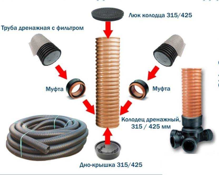 В системе присутствуют несколько видов колодцев, одни из которых обязательны, в то время как от других можно отказаться. Колодец представляет собой гофрированную/гладкостенную шахту (трубу). Ее днище имеет проходные/тройник входы для дрен, расположенные перпендикулярно корпусу.