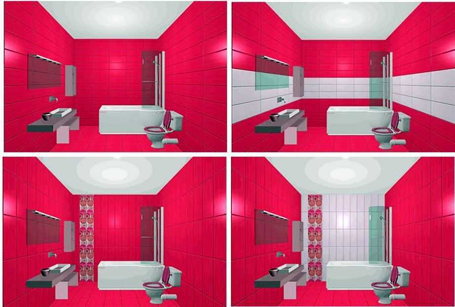При необходимости сделать потолок визуально выше, при вертикальной раскладке можно на одной из стен (желательно напротив входа) выложить полосу из более светлой плитки. Даже при условии яркой или темной плитки и затирки в тон, потолок «приподнимется». Если же на этой стене использовать кафель более светлого тона, да еще с контрастной затиркой и вертикальной полосой из плитки с орнаментом, эффект будет еще более явным (на рисунке внизу справа).