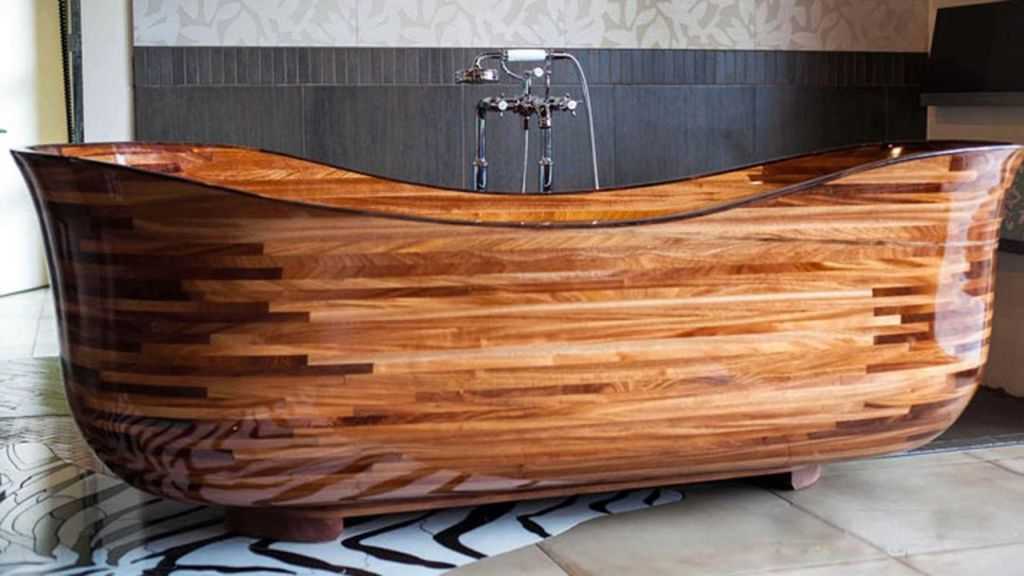 Есть модели и из дерева. Деревянные смотрятся эксклюзивно и роскошно. Литую ванну можно оформить мозаикой.