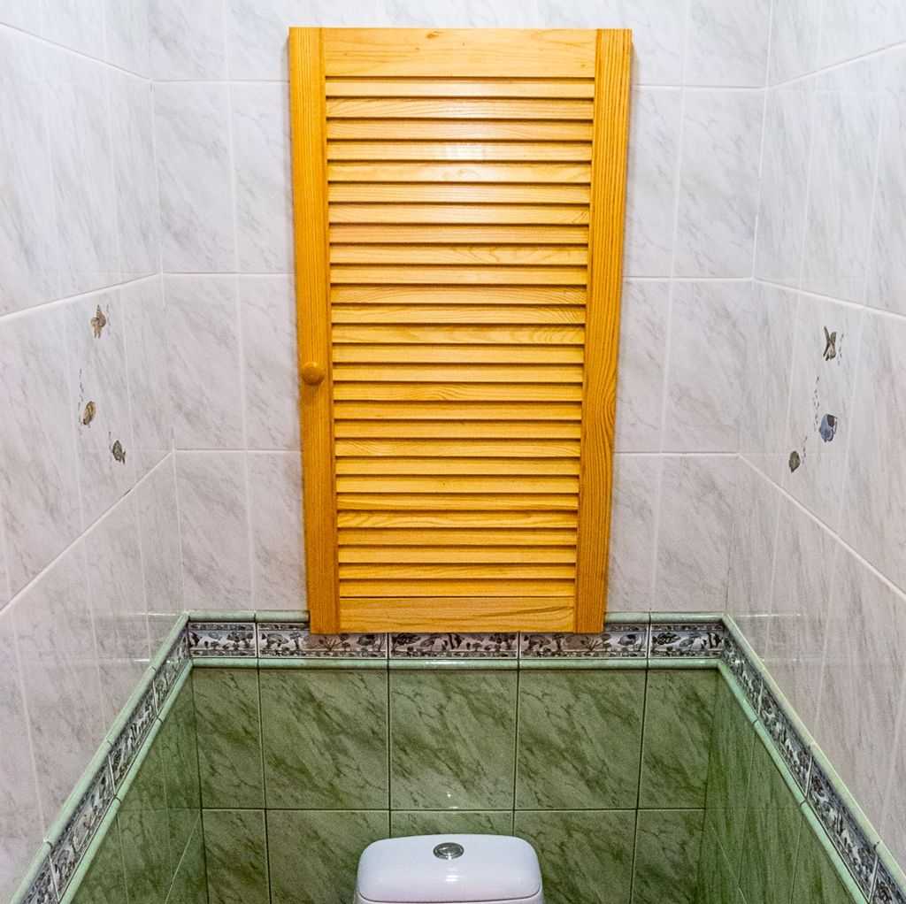 Чтобы спрятать коммуникации можно воспользоваться жалюзийными дверцами, для этого придется сделать шкаф либо установить бруски по периметру проема. Этот вариант подходит, если между унитазом и проемом достаточно места для открывания створок. Обычно снизу такого места не остается, там, чтобы закрыть трубы, можно закрепить глухую решетку, а вот выше бочка унитаза можно смело монтировать открывающиеся дверцы.